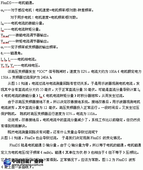 從圖1-4知道,FluxDs幾乎為常數。用示波器觀測電機電壓波形沒有發現畸變。為了進一步驗證,我們換上舊的浪涌吸收器,變頻器運行一會后又出現過流。目前變頻器工作穩定可靠。