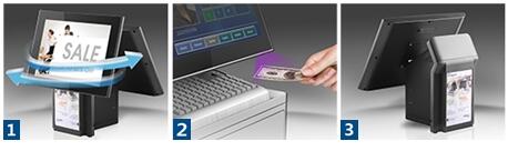 1.獨特的塔型結構設計,節省柜臺空間,并配有可調式第二顯示屏