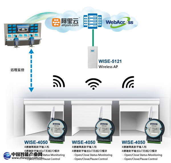 針對此項目必須偵測每個車庫門的開與關狀態(兩個數字輸入)、并從總部遙控車庫門的開啟/關閉/暫停(三個數字輸出)、以及整合視頻訊號等等需求,研華的物聯網云端監控平臺僅以無線I/O模塊WISE-4050與圖控軟件WebAccess這兩款產品即能完成對遍及各地的車庫進行遠程監控。而且受惠于研華產品可支持MQTT協議,用戶只需租用公有云服務并在其服務器內安裝WebAccess,車庫門監控系統就能透過裝設在現場的WISE-4050來接收訊號與觸發裝置,既省下了購買服務器、交換器、IP地址、網絡線路等費用,也縮短了系統開發周期。在該項目中客戶只花了半天的時間就完成了阿里云架設了圖控軟件并實現了遠程控制。