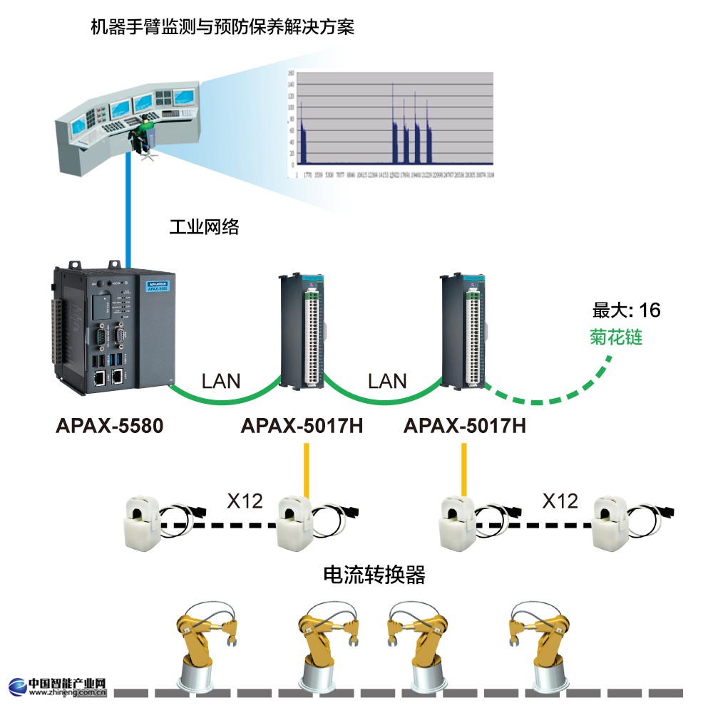 研華以APAX-5000系列PAC控制器搭配模擬量輸入模塊與分布式工業以太網總線所規劃出的機器手臂監測與預防保養解決方案,可滿足這家面板制造企業高速擷取數據的需求。其中,所選研華的APAX-5580控制器曾在第十四屆中國自動化年度評選中斬獲2016年中國自動化創新產品獎,其內建Intel處理器的APAX-5580不但是一臺可提供高效運算的工業計算機,也是一款可靈活整合各種I/O模塊的控制平臺,此外,通過12通道模擬量輸入模塊APAX-5017H來連接六軸機器手臂上的傳感器(Current Transformer),APAX-5580可以將APAX-5017H模塊收集來的模擬量信號暫存于內部硬盤內,而中控室的監測系統即可通過工廠內部網絡并根據用戶設定的時間(每隔五分鐘或每隔十分鐘)定時收集工業計算機內的數據,以詳細的電流變化信息分析機械手臂是否有異常狀況。