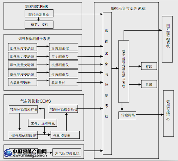 系統(tǒng)包括顆粒物測(cè)量子系統(tǒng)(煙塵濃度)、氣態(tài)污染物濃度測(cè)量子系統(tǒng)(SO2、NOX)、煙氣參數(shù)測(cè)量子系統(tǒng)(測(cè)量煙氣溫度、煙氣壓力、流、煙氣含氧量、煙氣含濕量和數(shù)據(jù)采集處理及通訊子系統(tǒng)(顯示和打印各種參數(shù)、圖表并通過數(shù)據(jù)圖文傳輸系統(tǒng)傳輸至管理部門)四部分,除了對(duì)上述的環(huán)保監(jiān)測(cè)外,同時(shí)對(duì)電力及冶金、水泥行業(yè)工藝過程監(jiān)測(cè)。