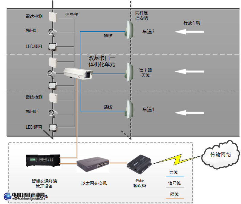 外場雙基基站建設:除了收費區域、收費標準外,還有要圍繞收費區域的各出入口建設識別基站,原則上每條道路的出入口都需要建設,建議采用大華雙基識別基站,既采集車輛過車照片,也采集電子車牌讀卡信息,并且建立兩者之間的關聯。以單向三車道為例,采用大華700萬卡口雙基一體化抓拍單元,路口設備布置圖如圖所示。