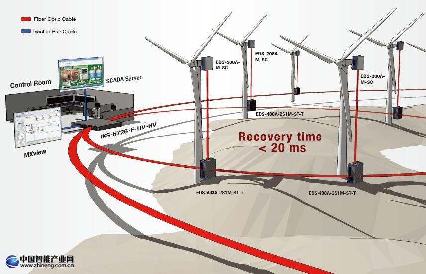 由于需要極高的安全性和可用性,DSTW在風場部署了一個環(huán)形拓撲網(wǎng)絡結(jié)構(gòu),在網(wǎng)絡連接失敗時能夠提供快速冗余??刂浦行牟捎昧薎KS-6726 機架式網(wǎng)管型工業(yè)以太網(wǎng)交換機來連接現(xiàn)場SCADA系統(tǒng)中的交換機和網(wǎng)管服務器。Moxa MXview 網(wǎng)絡管理軟件會自動發(fā)現(xiàn)網(wǎng)絡拓撲,并顯示實時報警信息,幫助管理員操輕松監(jiān)視網(wǎng)絡狀態(tài)。