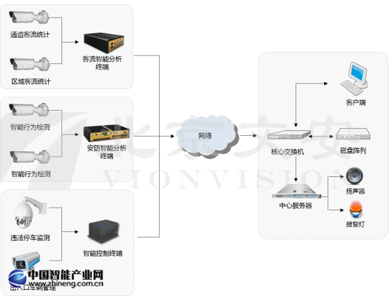 系統主要由客流統計攝像機、客流智能分析終端、智能行為分析攝像機、安防智能分析終端、高清紅外網絡攝像機、高清智能攝像機、智能控制終端、報警燈、揚聲器、中心服務器等組成。
